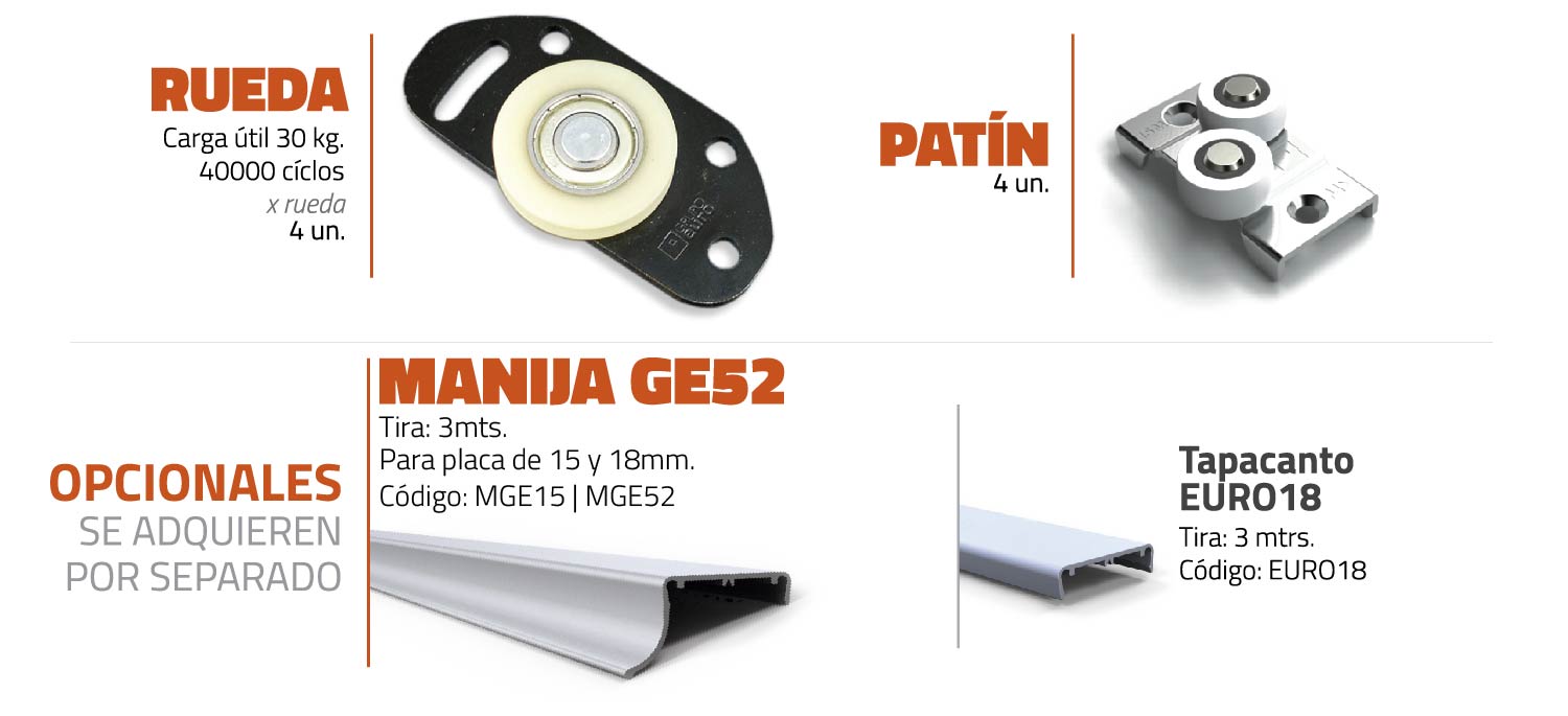 El kit incluye:1 Guía Superior de 2,00 metros, 1 Guía Inferior de 2,00metros, 4 Ruedas de 30 kg y 4 Patines