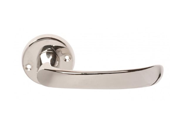 Manija doble balancin Alfa con roseta de Bronce de 48 mm. tornillos a la vista, con perno roscado. Disponible en Pulido y Niquelado.