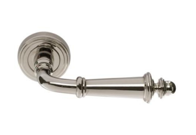 Manija doble balancin Calais con roseta y tapa roscada de Bronce de 52 mm. tornillos ocultos y sistema de retroceso. Consultar acabados disponibles.