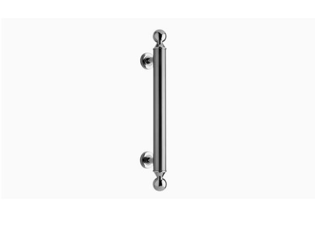Manijón Duna centrado con rosetas para puertas de madera o vidrio de 300 de tornillo a tornillo y de 400mm de largo total. Diámetro 38mm. Disponibles en dos variantes, con caño de bronce, bases y tapas de bronce o caño de acero inoxidable con base y tapas de bronce. Consultar terminaciones disponibles