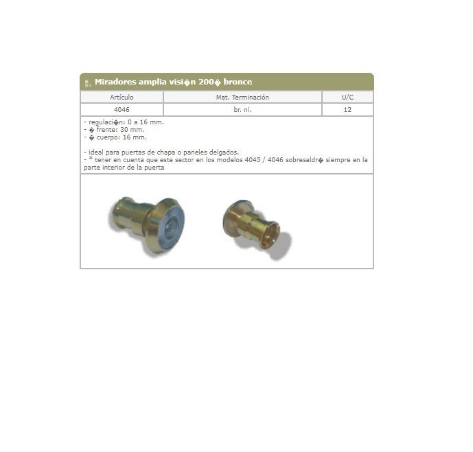 Mirador en bronce niquelado con regulacion de 0 a 16 mm, frente de 30mm y cuerpo de 16mm. Ideal para puertas de chapa o paneles delgados